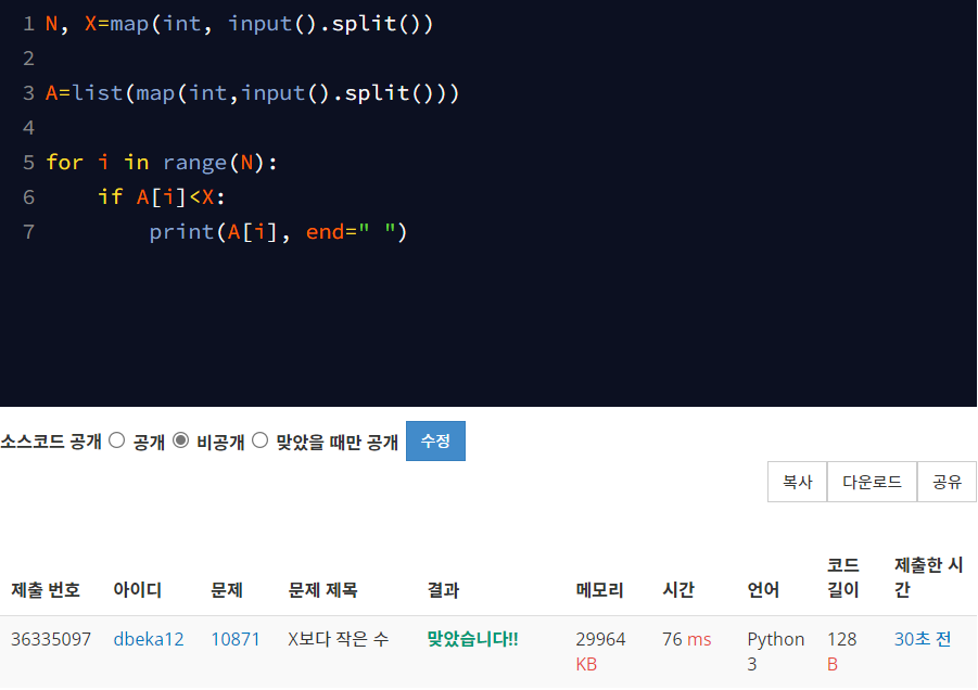 ㄴ보다 작은 숫자만 다시 출력하는 문제이다.