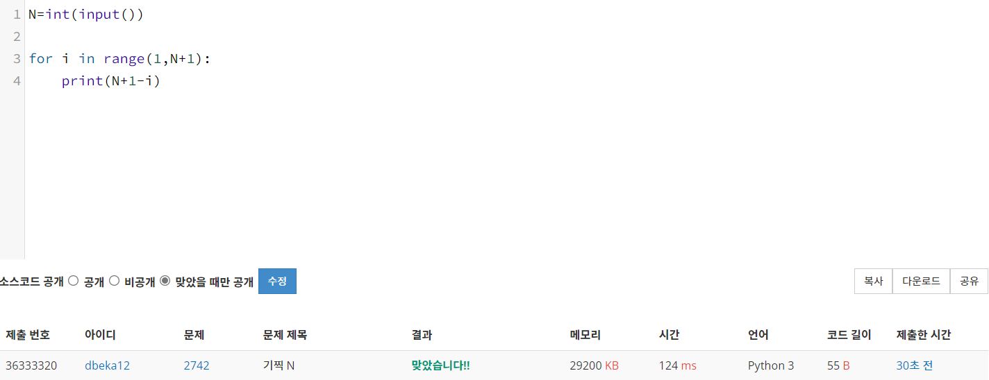 그러면 맨 처음에 i값은 1이니까 N이 출력될 것이고 맨 마지막 i값은 N이니까 1이 출력될 것이다.