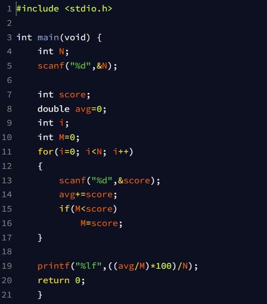 여기다가 싹 M으로 나누고 100을 곱하면 새로운 점수의 합을 구할 수 있다. 여기에 전체 과목 수인 N 나눠서 프린트하면 끝!