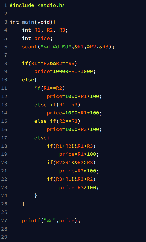 3개 주사위의 나온 눈이 주어질때 상금 계산 프로그램을 작성해보자